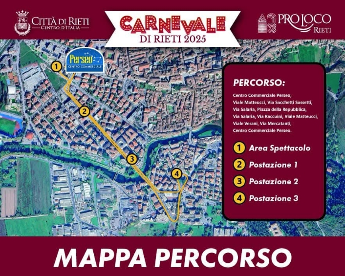 L’appuntamento è per le 14 nel piazzale del centro commerciale Perseo, poi il variopinto corteo si snoderà verso viale Matteucci e via Sacchetti Sassetti, per poi attraversare piazza della Repubblica e tornare al punto di partenza. Lungo il percorso ci saranno tre postazioni musicali, tutte curate da deejay e intrattenitori reatini, per poi concludere con dolci tipici carnevaleschi a cura dell’Associazione provinciale cuochi reatini.