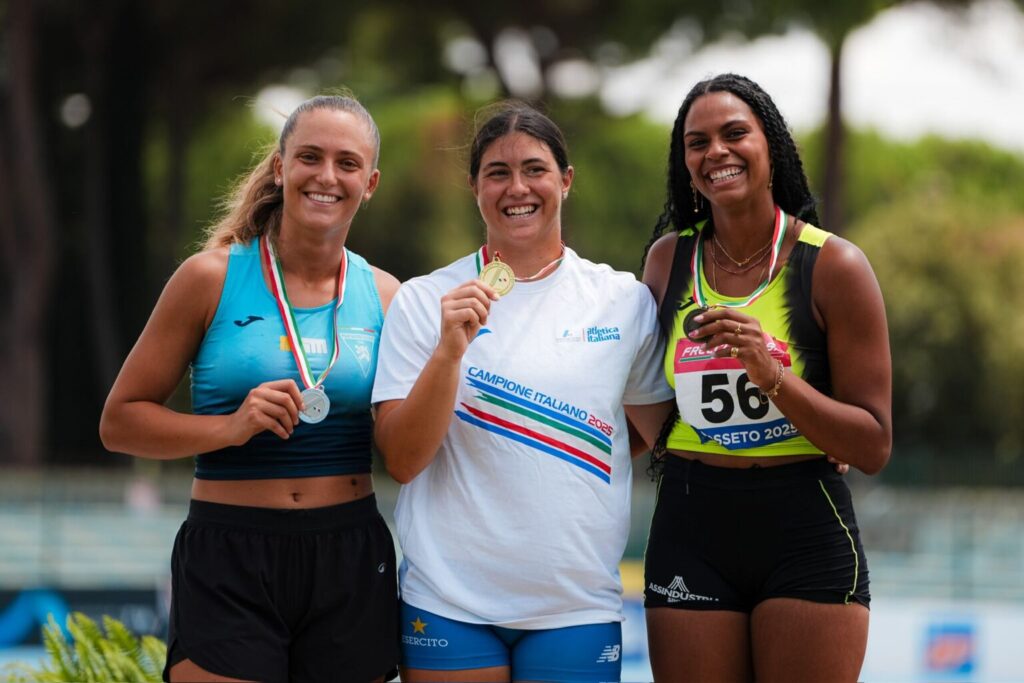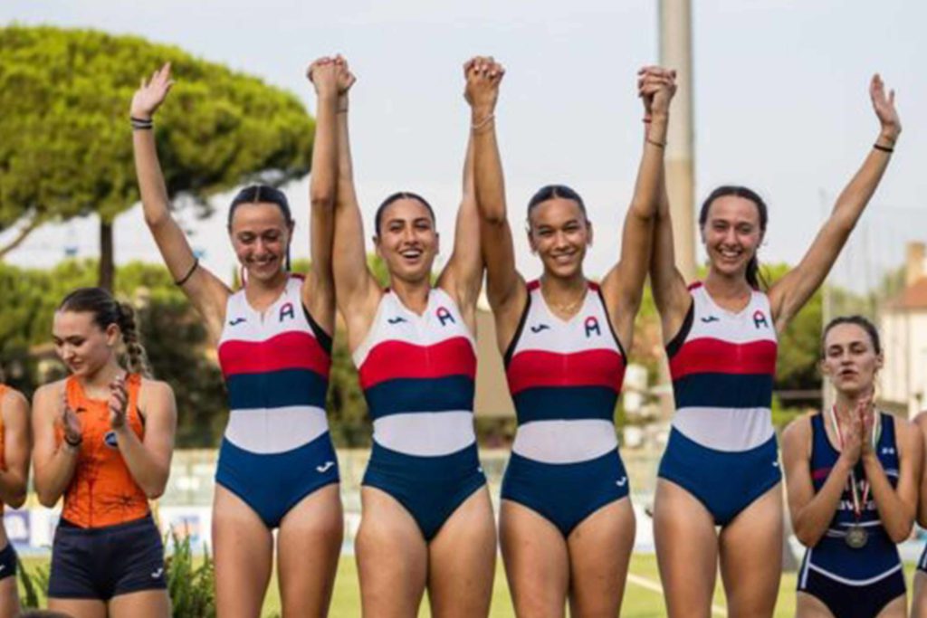 Terzo titolo in quattro anno per le Junior della staffetta 4×100. Cambiano le frazioniste, ma il quartetto rossoblù è sempre protagonista, dal 2022. Ginevra Baglioni, Virginia Capasso, Lavinia Capasso e Laura Stella Varesi, già primatiste italiane Under20 quest’anno, vincono con 45.74 e mettono al collo l’oro.