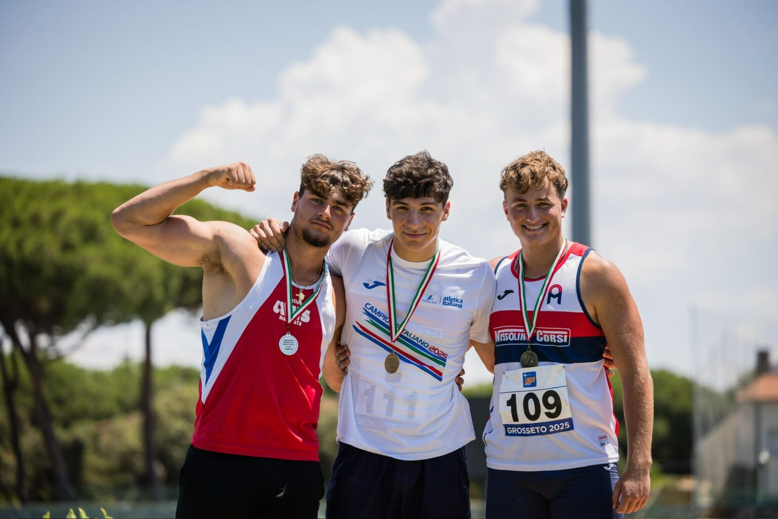 BRONZO. Prima volta sul podio per Valerio Paionni e Luca Mica. L’allievo di Mauro Leoni Paionni ha dimostrato anche a Grosseto di attraversare un grande momento e si è preso il terzo posto nel disco sfiorando i 50 metri. Luca Mica fa la scelta giusta, si concentra solamente sui 1500 e lotta fino in fondo nel gruppo di testa; terzo vicino al personale alle spalle dei gemelli Coppalo. Federico Morseletto non è ancora al top della condizione, ma è in crescita, così come la sua serie di salti che lo porta fino a 15,85 a vincere il bronzo.