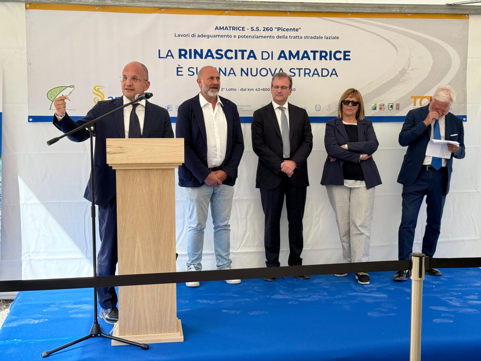 Il Commissario al sisma 2016 Guido Castelli oggi 4 agosto ha partecipato all’inaugurazione dei lavori di adeguamento e potenziamento della S.S. 260 “Picente” (2 Lotto, Variante di Amatrice, dal km 43+800 al km 41+150) insieme all’Amministratore delegato di Anas, Claudio Andrea Gemme, al Sindaco di Amatrice, Giorgio Cortellesi, all’assessore alle Politiche di Ricostruzione, Viabilità e Infrastrutture, Manuela Rinaldi e al Soggetto Attuatore incaricato da ANAS per la viabilità post-sisma 2016, l’ingegner Fulvio Maria Soccodato.