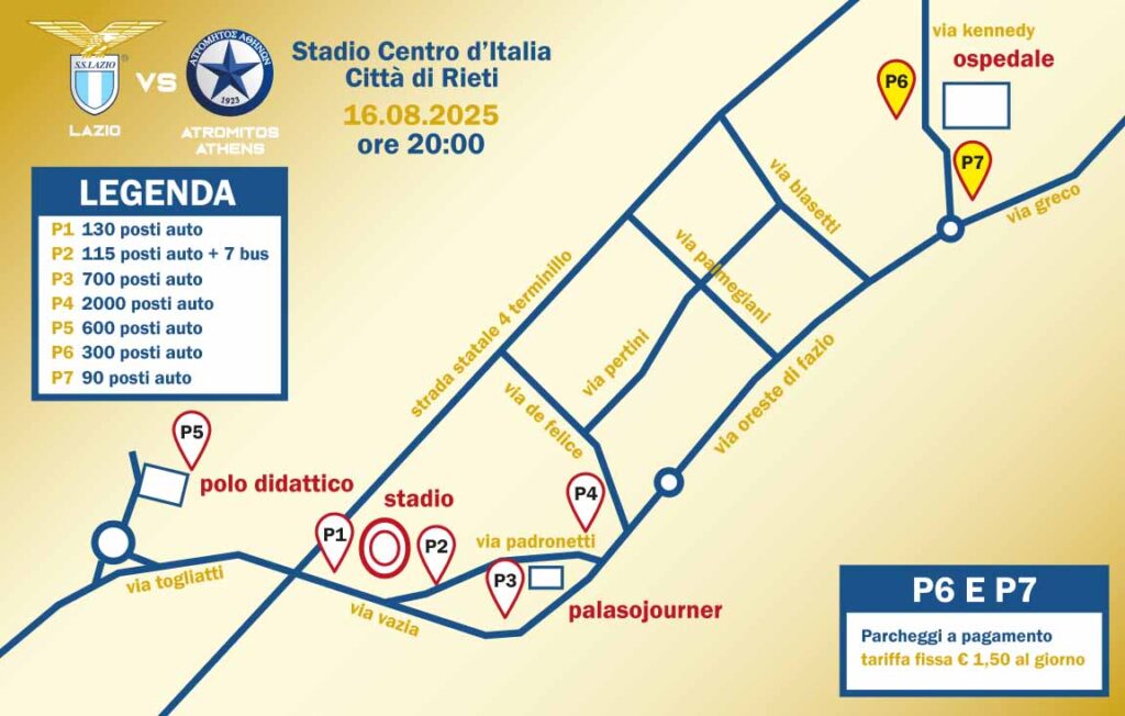 In vista della sfida amichevole tra Lazio e Atromitos di sabato 16 agosto alle 20 allo stadio Manlio Scopigno, è stato predisposto un piano parcheggi per facilitare l’afflusso degli spettatori e garantire una viabilità ordinata nell’area dell’impianto sportivo.