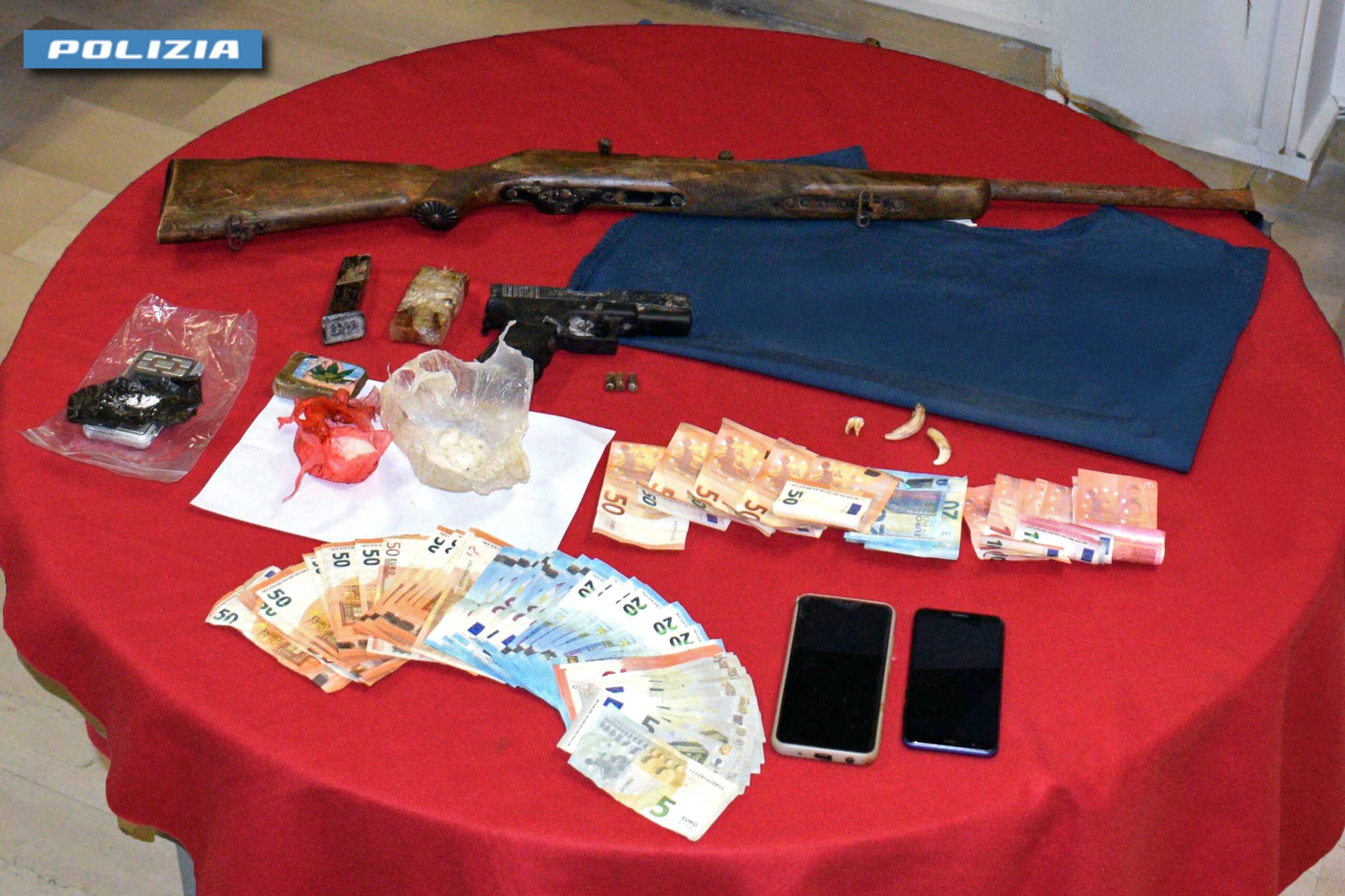 La perquisizione effettuata dagli Agenti della Polizia di Stato nell’area boschiva occupata dai malviventi, con una tenda e diversi bivacchi ha consentito il rinvenimento di oltre 100 grammi di Ketamina, che era stata sotterrata alla base di due alberi, una dose di cocaina, un bilancino digitale, nonché un fucile da caccia, sulla cui provenienza sono in corso accertamenti ed una pistola scacciacani con relativo munizionamento.