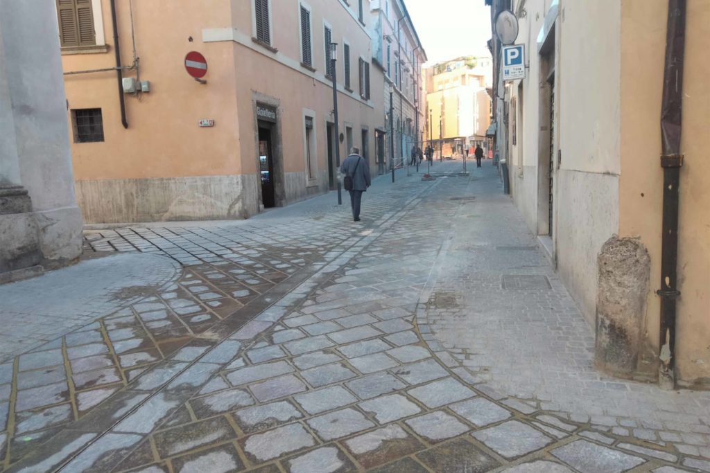 La strada si presenta completamente rinnovata, con nuove lastre e una pavimentazione uniforme, che restituiscono al centro storico un aspetto più ordinato e curato.