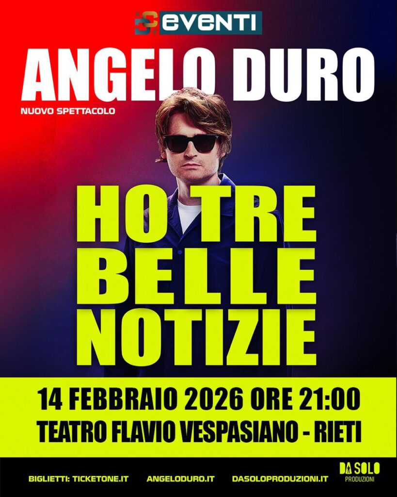 Partito a febbraio 2025 da Bari, “Ho tre belle notizie” sta registrando successo in tutta Italia, con numerose date già sold out. Dopo il trionfo di “Sono Cambiato”, con oltre 120 sold out in Italia e all’estero, Angelo Duro è pronto a travolgere il pubblico di Rieti con la sua comicità.