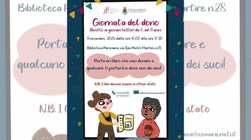 Durante l’evento, presso la Sezione Ragazzi, sarà inoltre inaugurato lo “Scaffale del libro sospeso”, uno spazio permanente dove sarà possibile lasciare un libro e prenderne un altro, favorendo così la circolazione di storie, emozioni e curiosità tra i giovanissimi lettori. Info: Biblioteca Comunale Paroniana – Via San Pietro Martire 28, Rieti