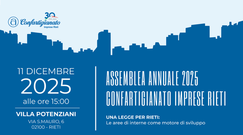 Confartigianato Imprese Rieti si prepara a celebrare l’Assemblea Annuale 2025, in programma giovedì 11 dicembre alle ore 15 nella prestigiosa cornice di Villa Potenziani. Un appuntamento che, anche quest’anno, punta a mettere al centro del dibattito il ruolo strategico delle aree interne come motore di sviluppo economico e sociale, tanto per la provincia di Rieti quanto per l’intero Paese.