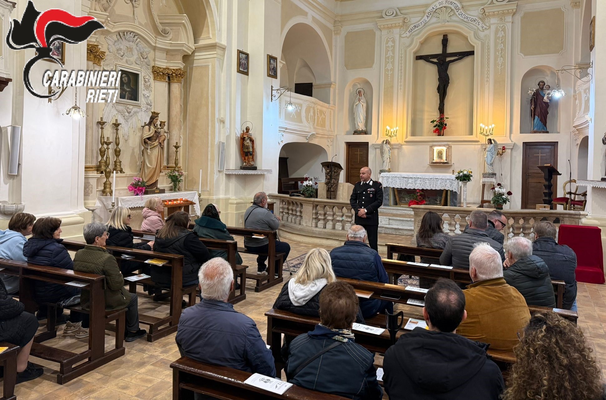 Nell’ambito della campagna informativa, il Maresciallo Maggiore Giacobbe Grieco, Comandante della Stazione dei Carabinieri di Orvinio, affiancato dai propri collaboratori, ha incontrato i cittadini dei Comuni rientranti nella competenza territoriale della Stazione. Gli incontri si sono svolti con la partecipazione di circa 30 persone presso la sede delle Suore della Carità di Pozzaglia Sabina, di una quarantina di cittadini nella Chiesa Parrocchiale di San Nicola di Bari a Orvinio e di ulteriori 40 partecipanti nella Chiesa Parrocchiale del Santissimo Salvatore a Turania, alla presenza dei Sindaci dei rispettivi Comuni.