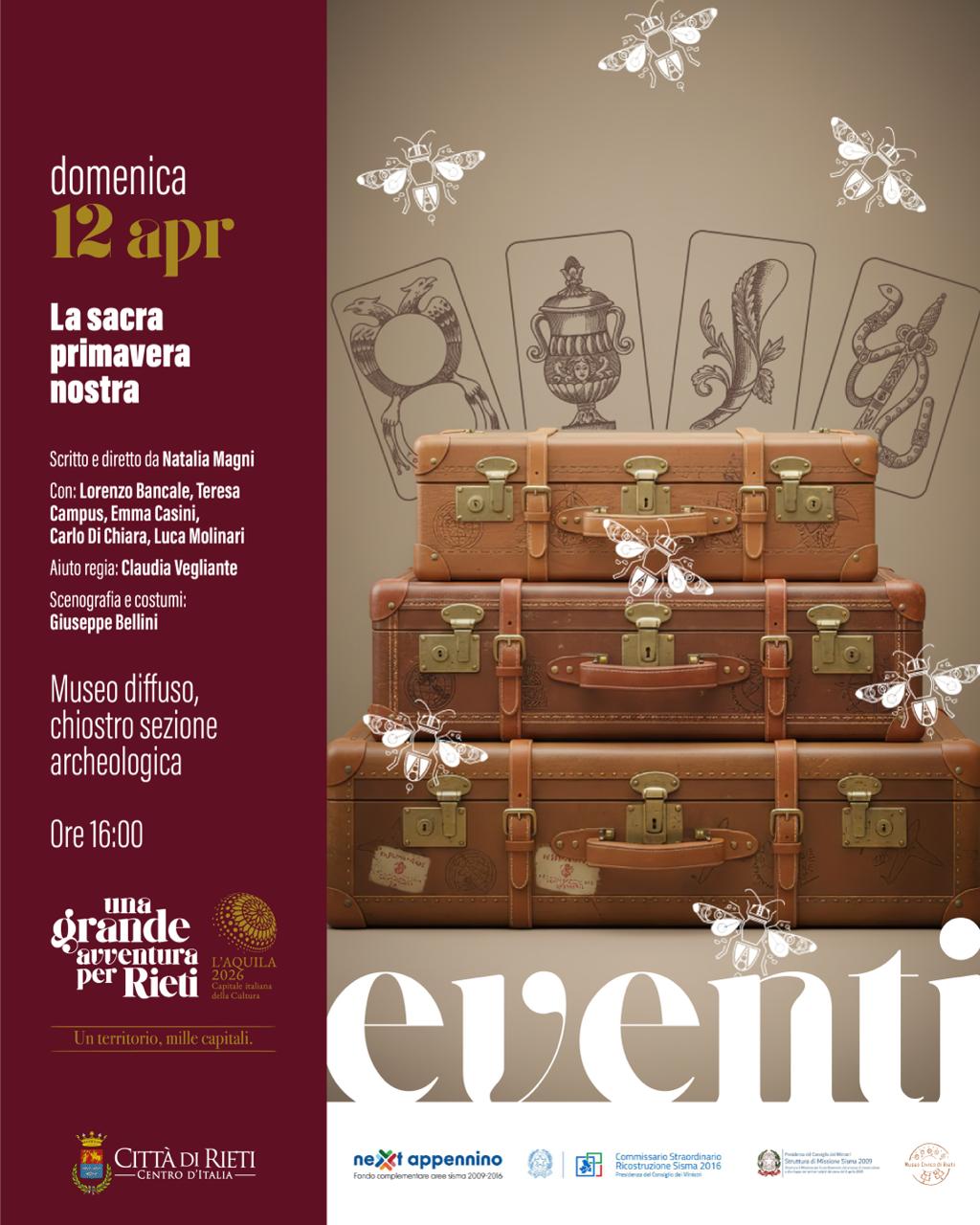 Nuovo appuntamento culturale a Rieti nell’ambito del percorso “L’Aquila2026, una grande avventura per Rieti”. Domenica 12 aprile alle ore 16, nel chiostro della sezione archeologica del Museo Diffuso Città di Rieti, andrà in scena la pièce teatrale “La sacra primavera nostra”, anteprima del Festival dei Popoli Italici che arriverà in città nelle prossime settimane.
